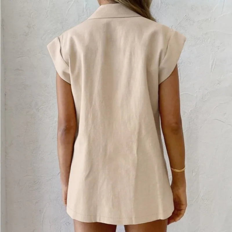 O Conjunto Carmen une a nobreza da fibra natural ao design arquitetônico. Feito em algodão encorpado, ele apresenta um colete alongado com ombros estruturados e um short de alfaiataria preciso. É a escolha definitiva para quem busca elegância fresca nos dias quentes.