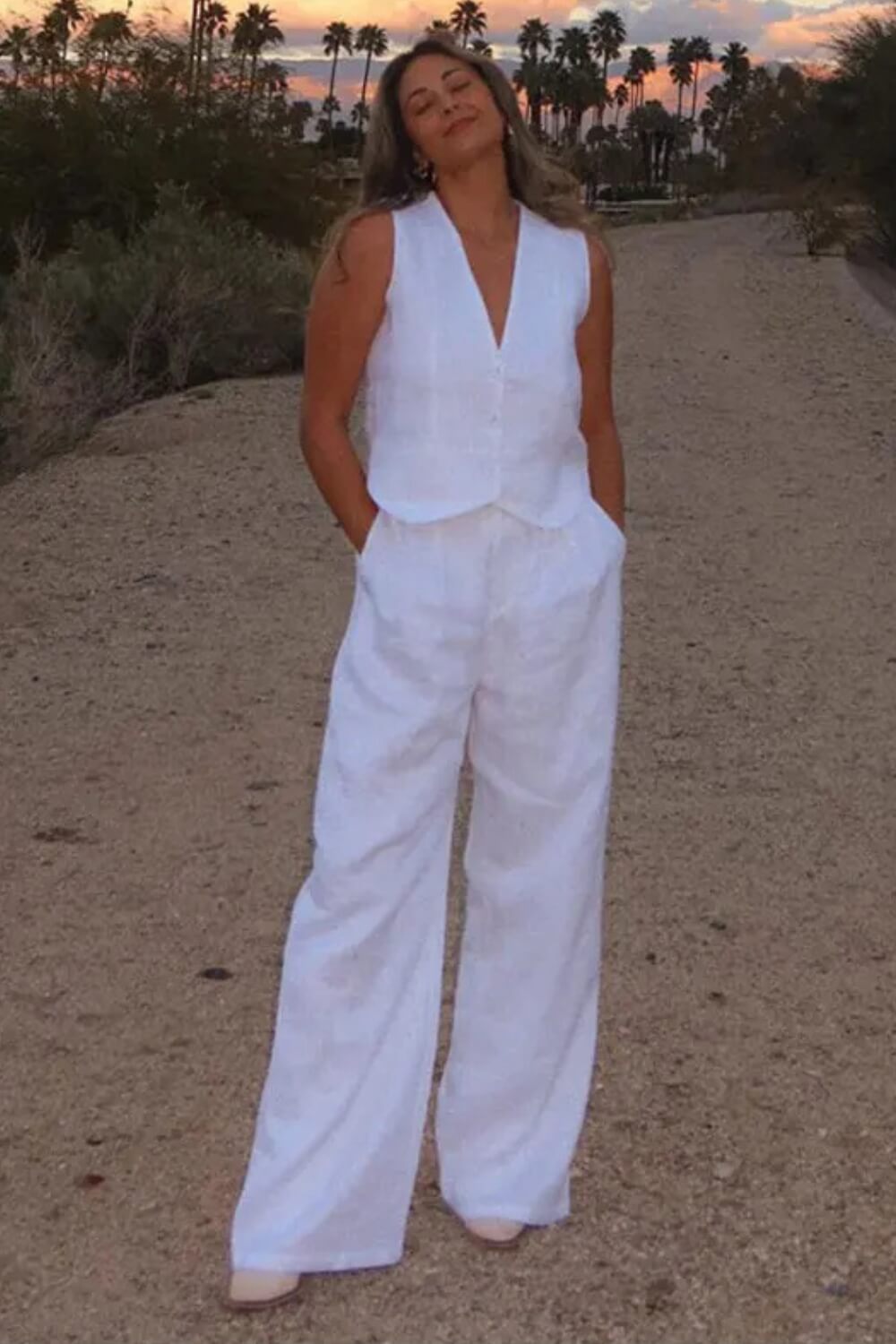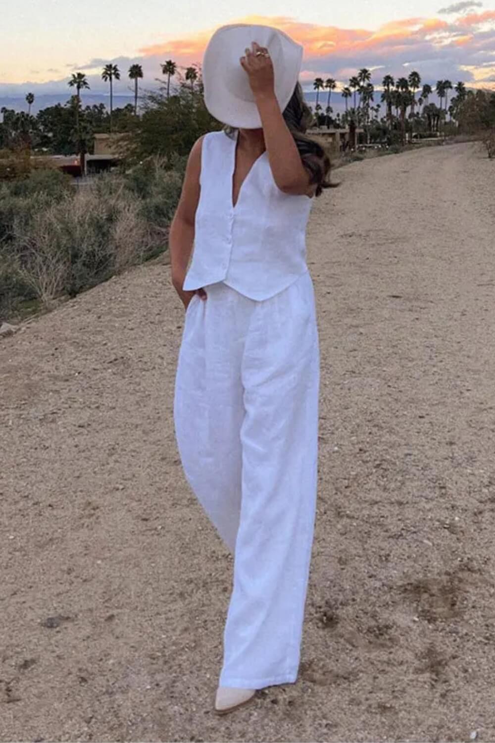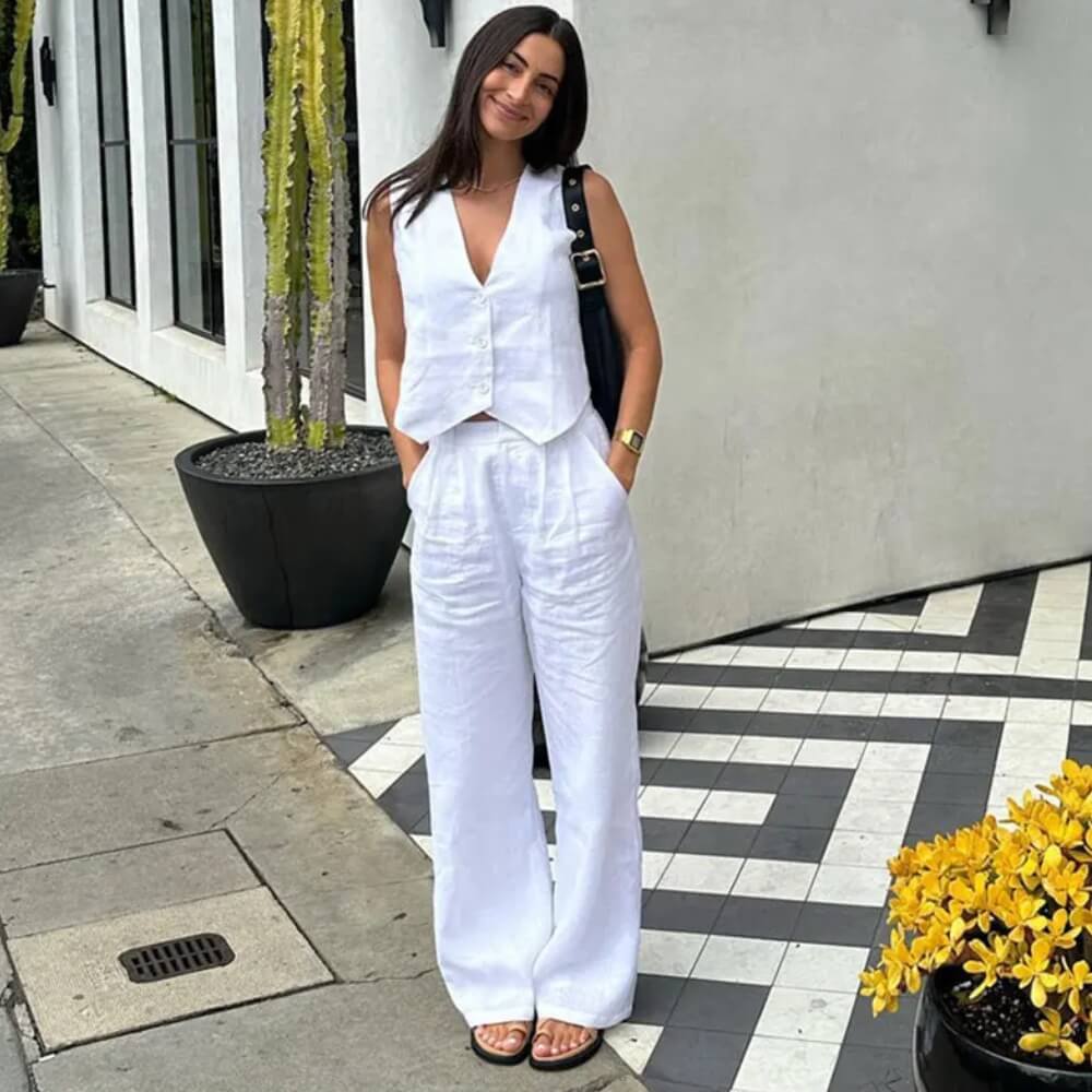 O Conjunto Glover traz a peça-desejo da temporada: o colete de alfaiataria. Combinado com uma calça pantalona fluida, ele cria um visual "Old Money" moderno, perfeito para quem busca sofisticação sem passar calor.