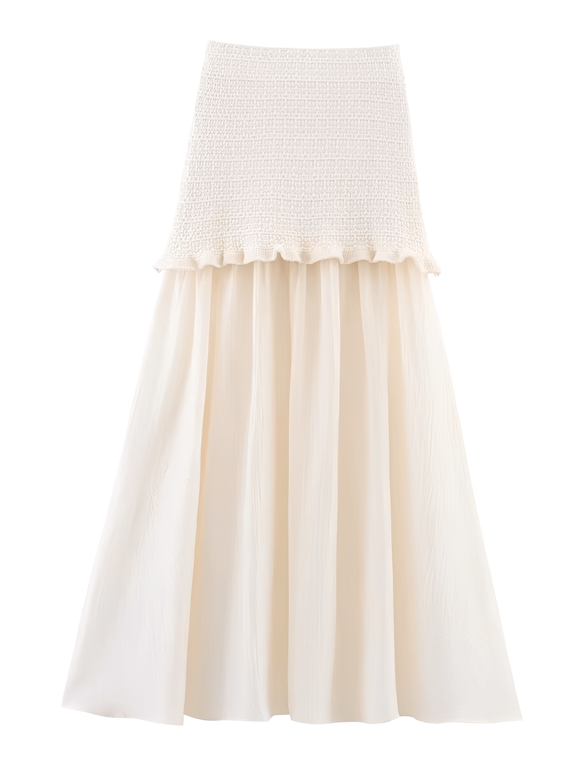 A blusa em tweed texturizado traz gola redonda, botões frontais forrados e bolsos funcionais — detalhes que elevam o acabamento. A saia longa plissada em duas camadas adiciona movimento elegante e conforto, com cós elástico para ajuste suave ao corpo.
