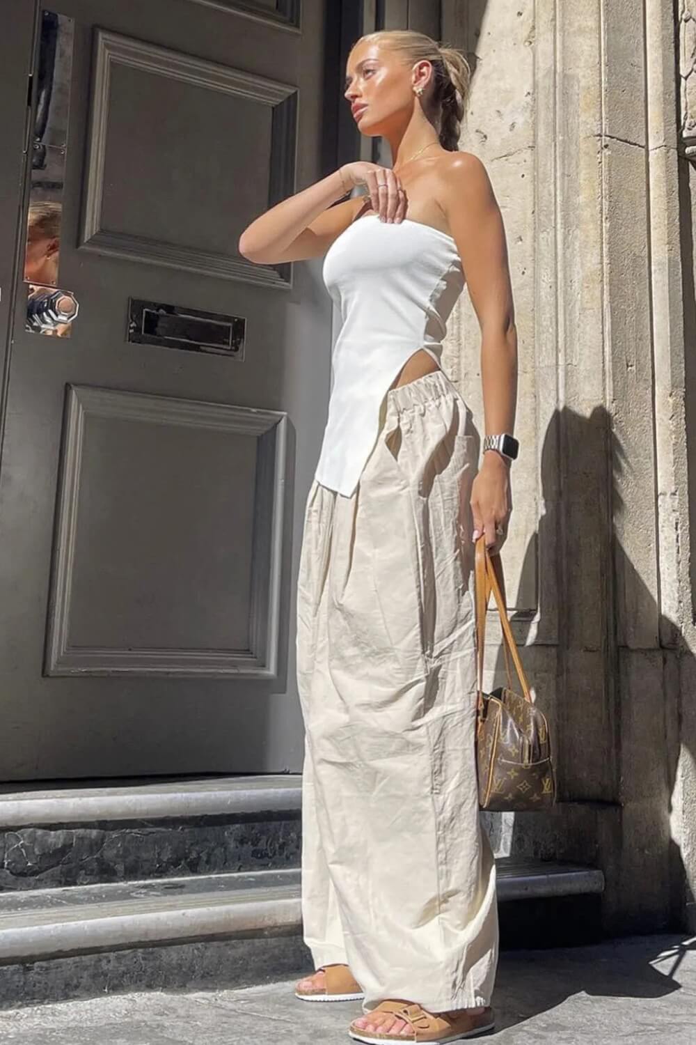 O Top Lindsay transforma o básico em statement. Sua modelagem tomara que caia justa ganha personalidade com uma fenda lateral profunda e barra assimétrica, criando um visual moderno e sexy.