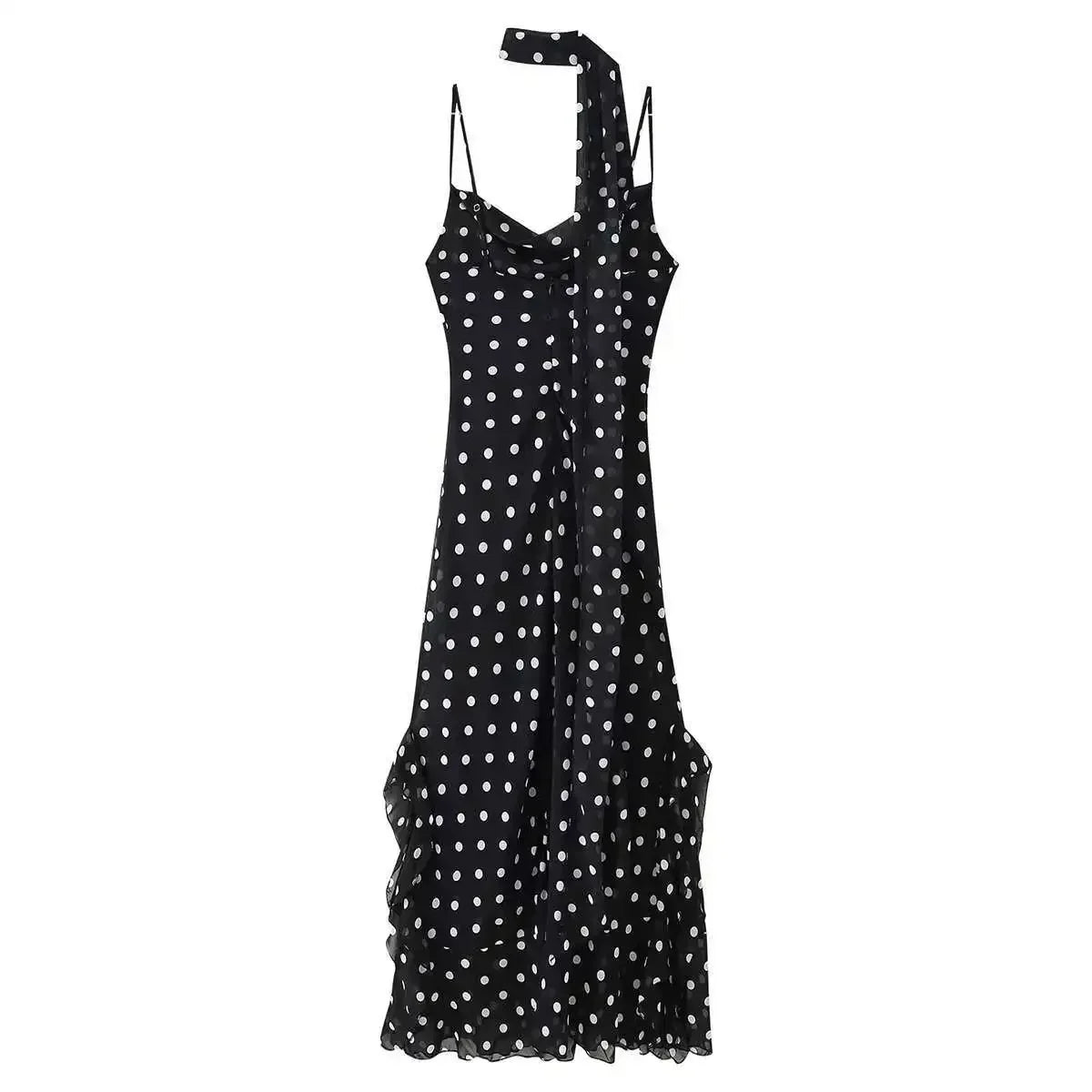 O Vestido Sofi captura a essência da feminilidade. A clássica estampa de poás (bolinhas) ganha vida em uma modelagem fluida com babados na barra e o toque final de sofisticação: um lenço alongado no pescoço. Uma peça que transita entre o retrô e o moderno com maestria.